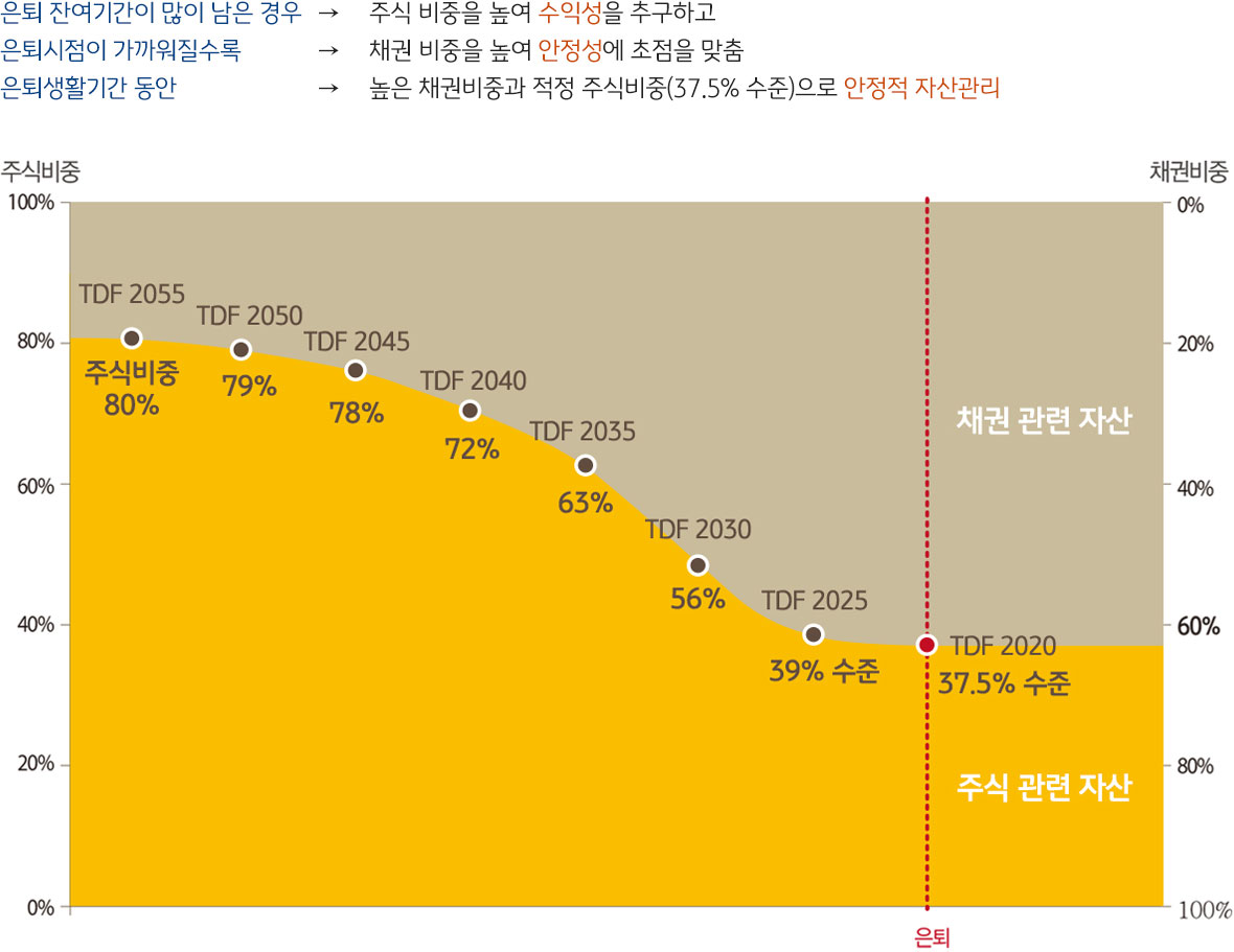 TDF는 펀드매니저가 개인의 은퇴시점에 맞춰 주식과 채권 비중을 조절하여 운용하는 펀드로, 투자자의 생애주기에 맞추어 글로벌 자산배분 및 리밸런싱이 이루어지는 펀드로, 개인이 크게 신경쓰지 않아도 알아서 굴러가는 펀드라고 할 수 있습니다