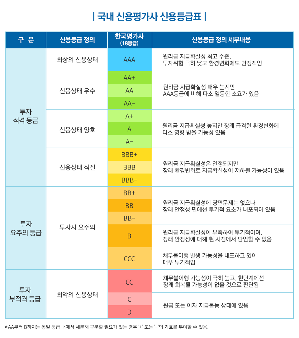 개별채권 구매 시 꼭 해당 채권의 신용등급을 파악해야합니다. 채권 신용등급은 채무자(기업,정부 등)가 채무를 상환할 능력이 있는지 등 채권의 위험등급을 파악하기 위한 기준이 되는 등급으로, 투자자는 채권에 투자할 때 꼭 신용등급을 확인해야합니다.
