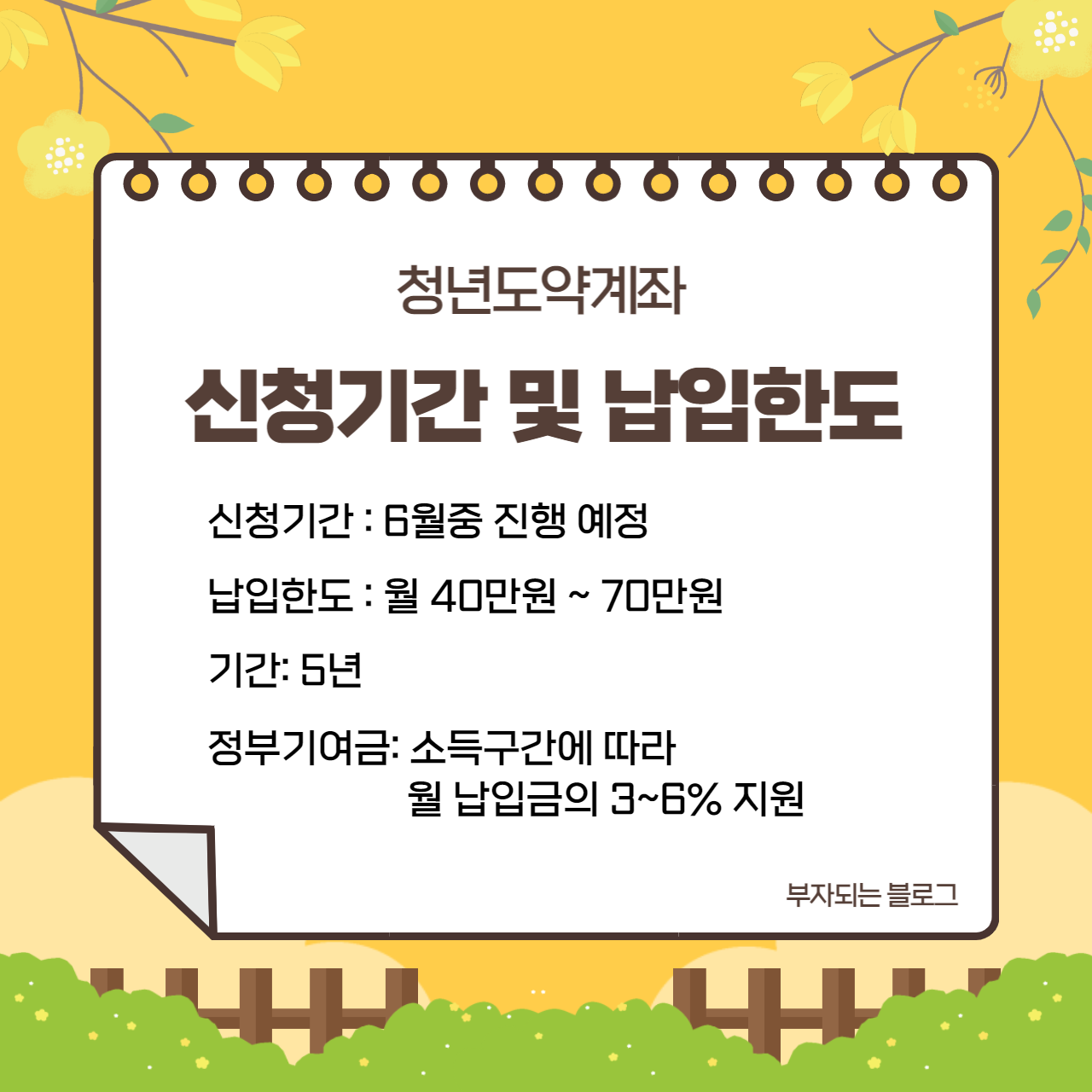 청년의 중장기 자산형성을 위해 올 6월 새롭게 출시되는 청년도약계좌. 정부지원으로 목돈을 마련할 수 있는 좋은 기회인만큼 본인의 소득과 저축가능한 기간 및 금액을 고려해서 슬기롭게 활용하시는 것을 추천드립니다