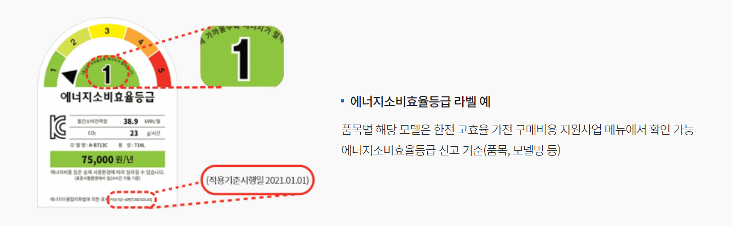 에너지소비효율등급라벨의 '등급'과 '적용기준시행일'을 확인하신 후 지원 대상일 경우에만 신청이 가능하니 신청 전 꼭 확인하시는 것을 추천드립니다.